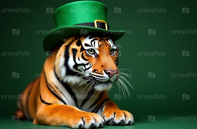 Тигр в традиционном зеленом ирландском костюме с шляпой, открытка на День Святого Патрика