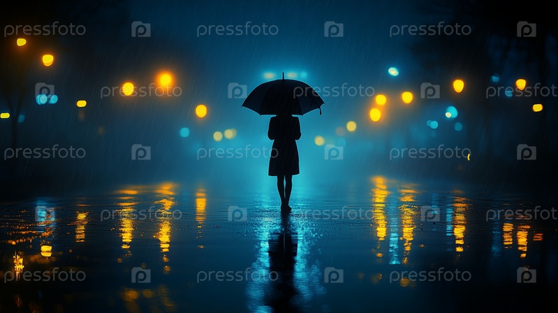 Женщина держит зонтик под дождем ночью