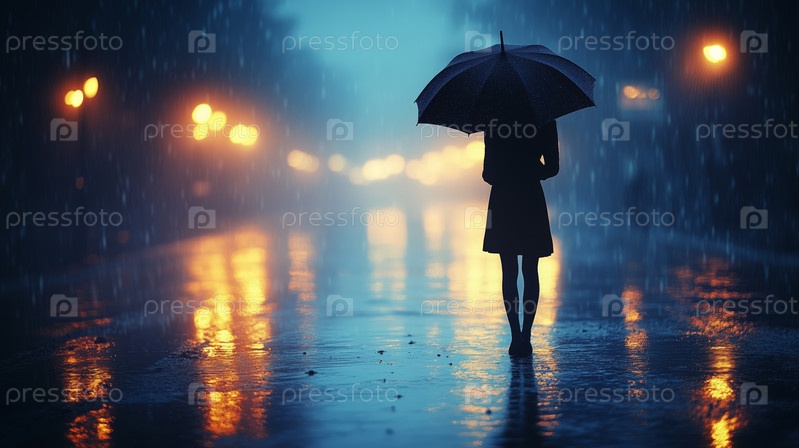 Женщина с зонтиком идет по дождливой городской улице ночью