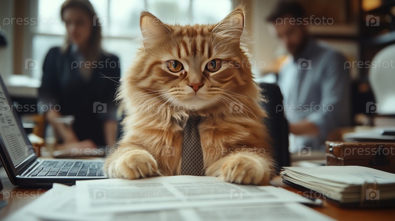 Имбирный кот в галстуке работает на офисном столе с документами и ноутбуком