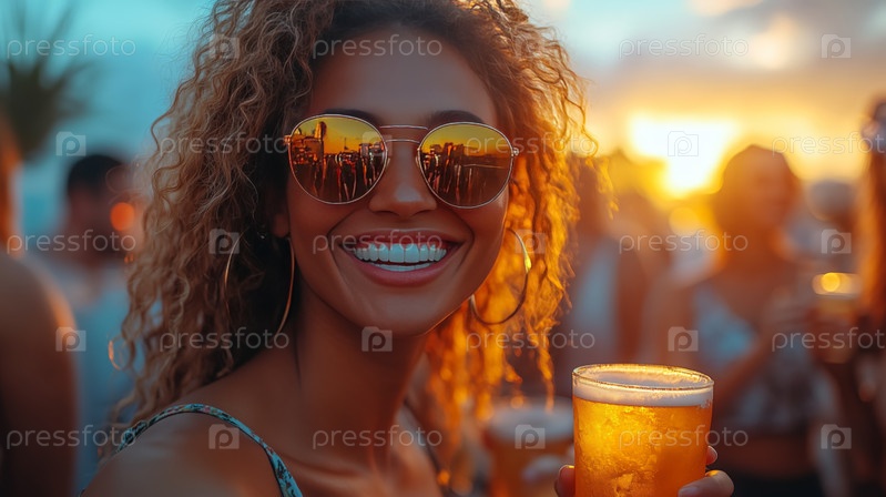 Улыбающаяся женщина держит пиво на вечеринке за закатом