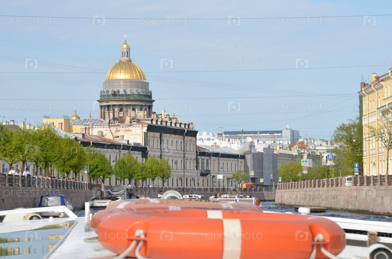 Вид на собор Святого Исаака и развитие набережной реки Мойка с лодки для отдыха в Санкт-Петербурге