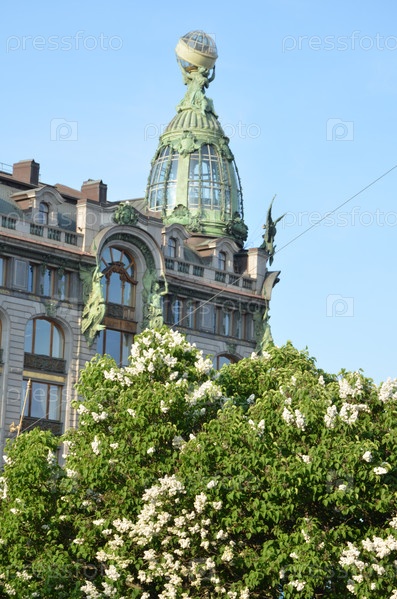 Дом компании певца в Санкт-Петербурге летом среди цветущего лилового куста