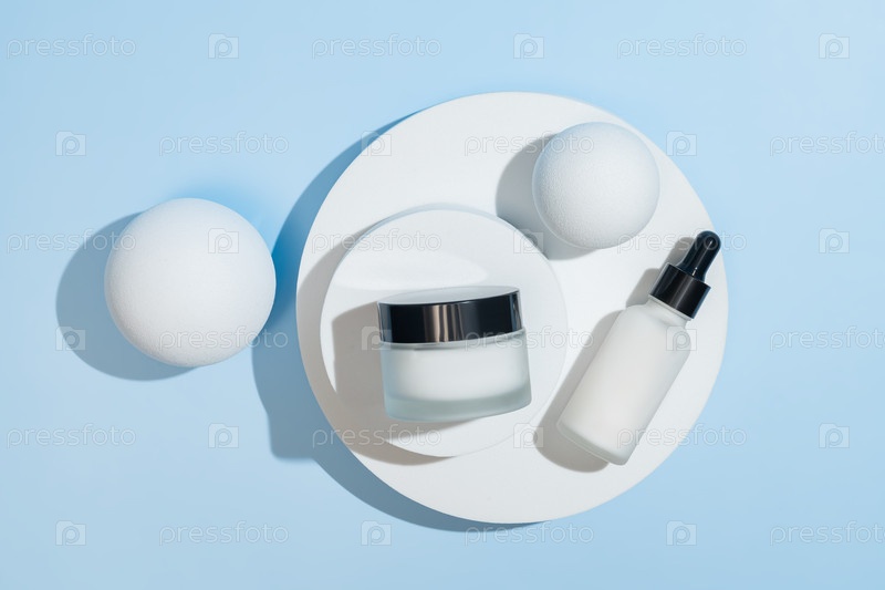 Минималистическая бутылка с белой сывороточной смесью и кремом может быть показана на белом круглом стенде, простом элегантном представлении косметического продукта
