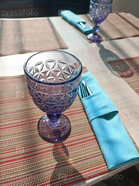 Пустое голубое стекло на столе в кафе со светлыми отражениями минималистического напитка натюрморта для меню и блогов