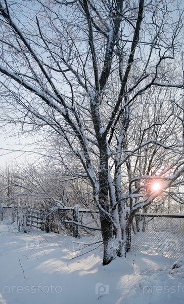 Зимний снежный ландшафт в деревне с заходящим солнцем