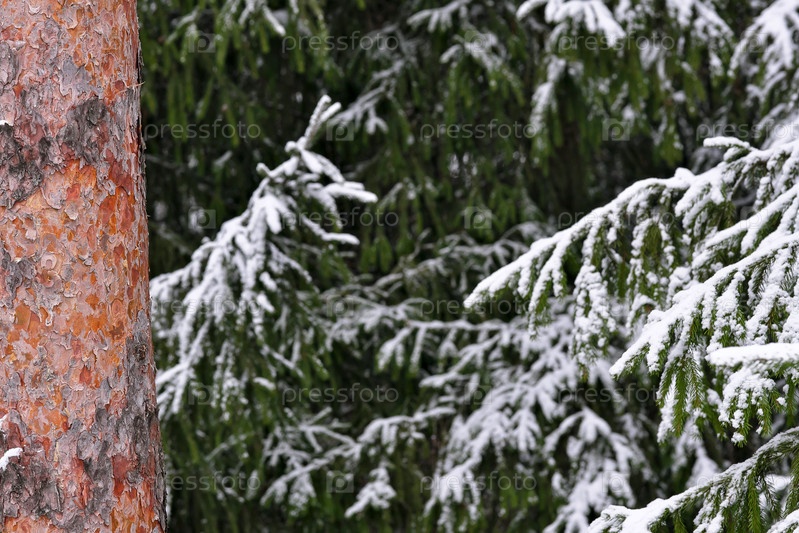 Сосна и сосны в снегу зимнего леса. изолированный сезонный фон