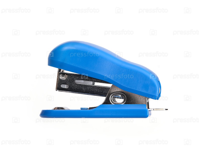 Небольшой синий сцепщик для бумаги, изолированный на белом фоне