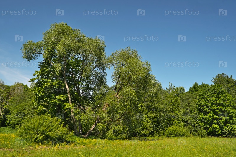 Летний пейзаж с голубым небом и зелеными полянами на краю леса