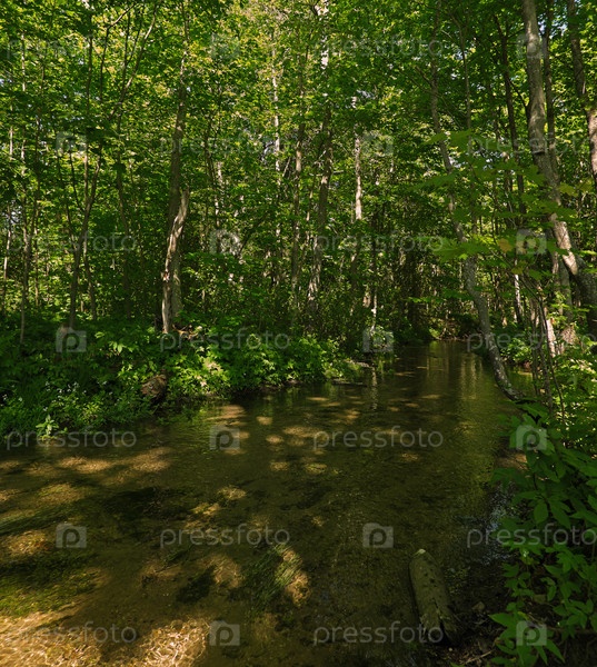 Летний пейзаж в лесу с ручкой в тени деревьев