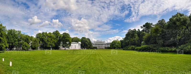 Россия, Санкт-Петербург, Масляная луга и Елагинский дворец на острове Элагин в солнечный летний день (панорама)