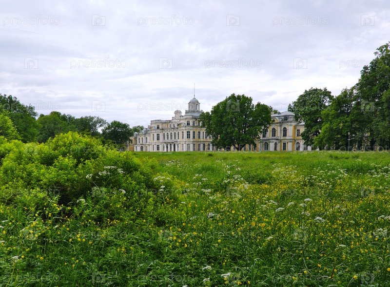 Усадьба Знаменка через дикие цветы и дождевые облака.Петродворец (Peterhof, Санкт-Петербург, Россия)