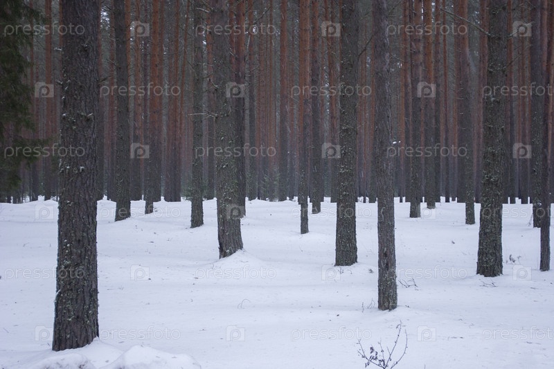 Зимний пейзаж в сосновом лесу с прямыми бортовыми стволами, стоящими в прямых рядах
