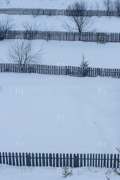 Снежный ландшафт зимой с деревянными заборами, расположенными рядами для создания ощущения глубины