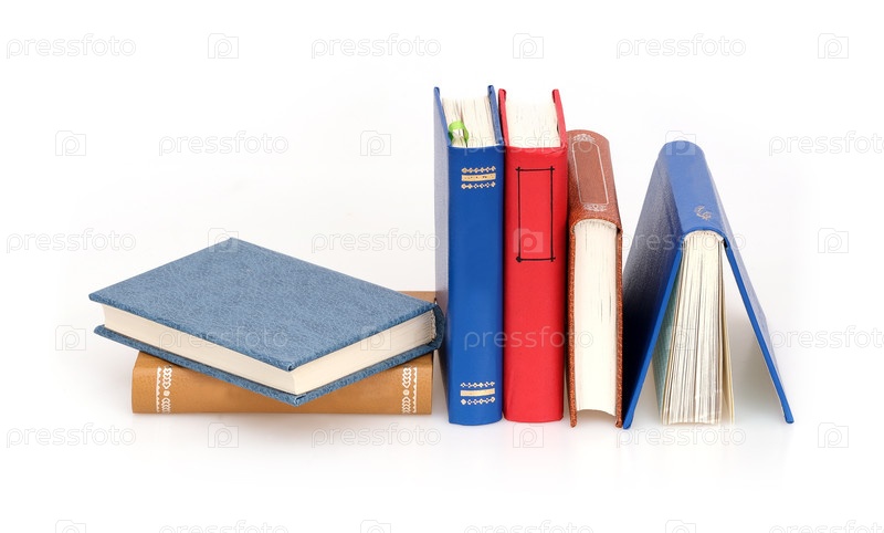 Куча книг в цветных обложках с белыми листами, изолированными на белом фоне