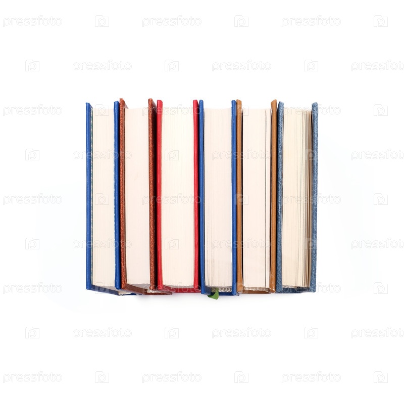 Куча книг в цветных обложках с белыми листами, изолированными на белом фоне