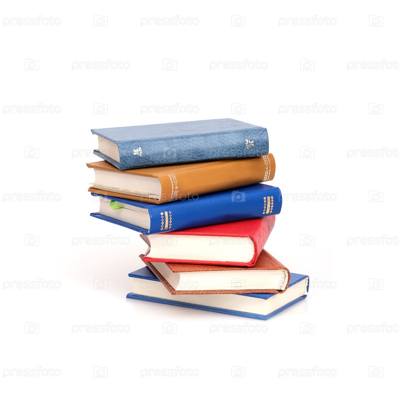 Куча книг в цветных обложках с белыми листами, изолированными на белом фоне