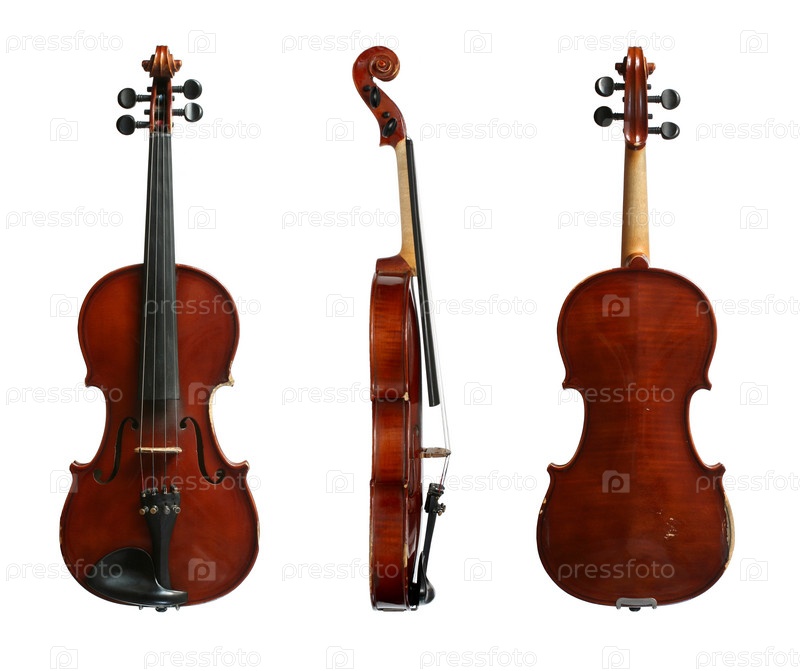 Скрипка на белом фоне в трех проекциях. Вид сверху, сбоку и снизу