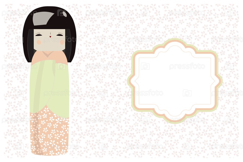 Векторный рисунок. поздравительная открытка с японской куклой (кокези) в традиционном национальном костюме и картриджем в японском стиле