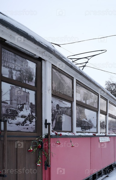 Памятник блокадному трамваю в Ленинграде.Зимний вид, Россия, Санкт-Петербург