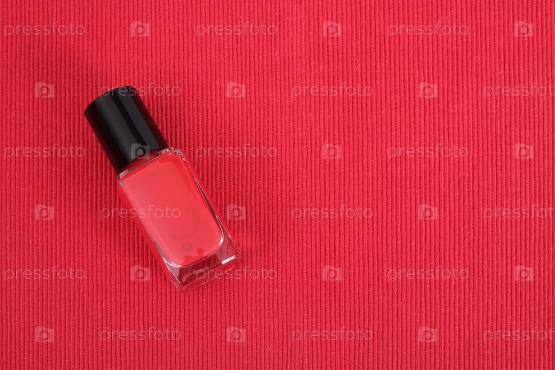 Бутылка для полировки ногтей изолирована на красном текстильном фоне