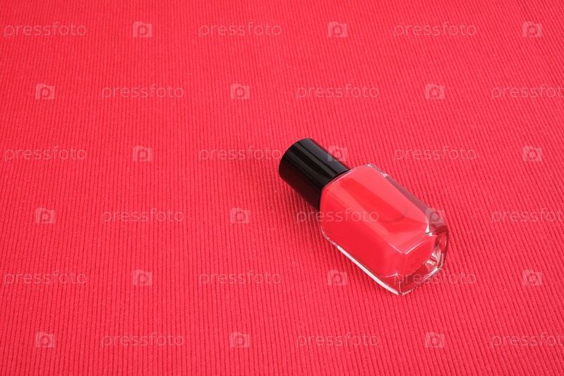 Бутылка для полировки ногтей изолирована на красном текстильном фоне