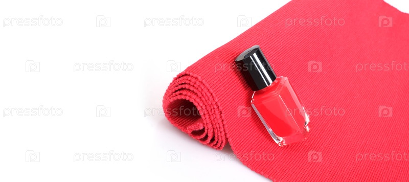 Бутылка для полировки ногтей изолирована на красном текстильном фоне