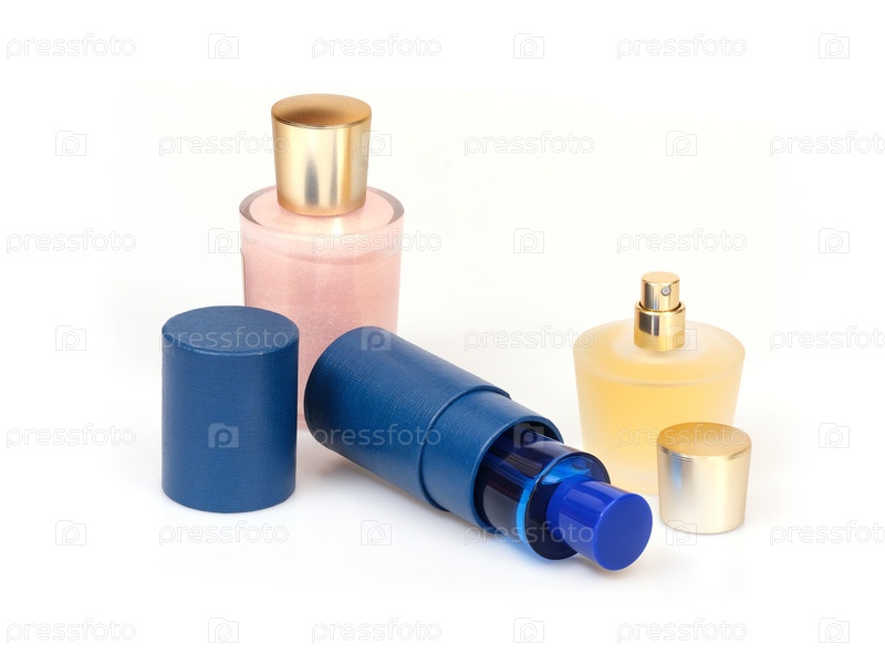 Положение бутылок для парфюмерии, изолированных на белом фоне