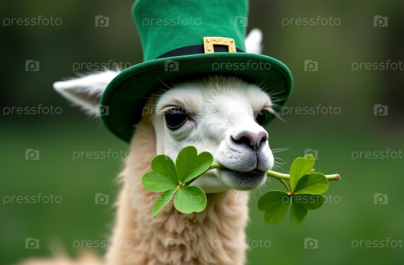 Лама в традиционном зеленом ирландском костюме с шляпой, открытка на День Святого Патрика