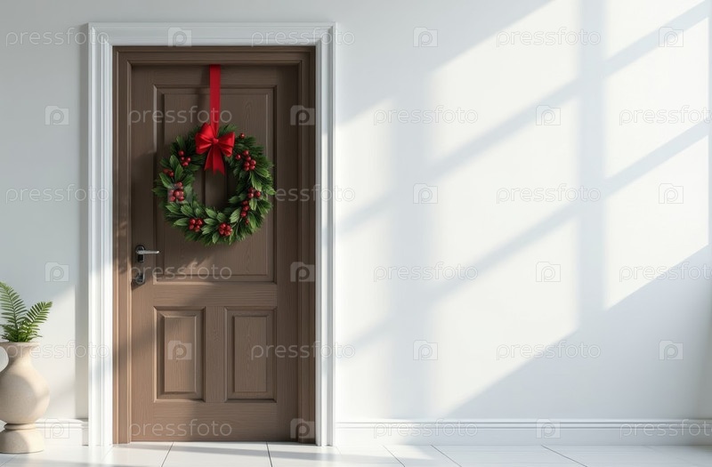 Входная дверь украшает омель рождественской ветви, текст на стене. искусственно созданный