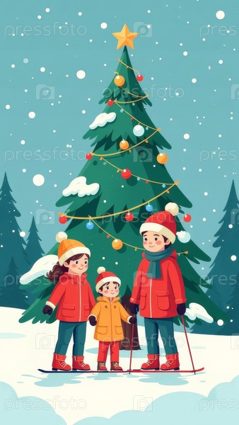 Семья, созданная искусственным интеллектом, во время новогодних каникул на горнолыжном курорте мама, папа и ребенок катаются на лыжах в снежных горах, горах и рождественской елке
