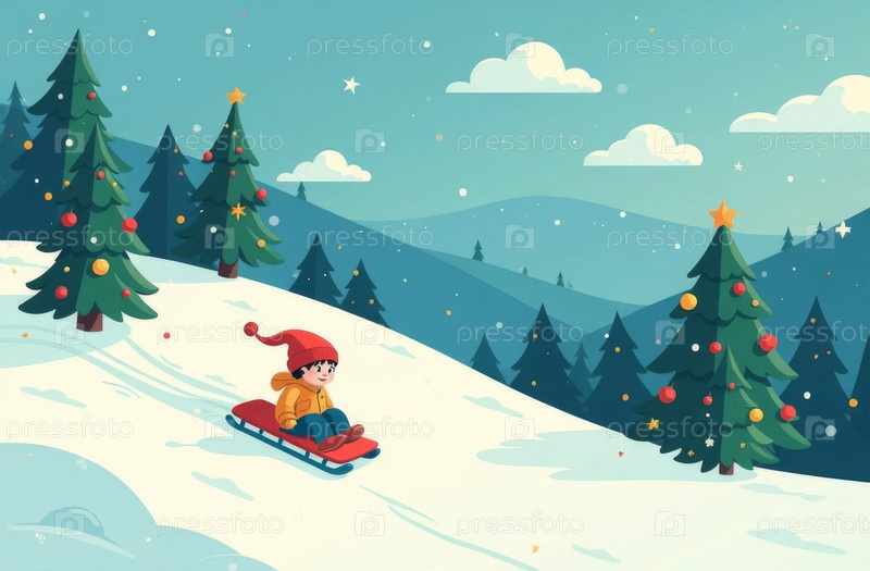 Искусственно созданные детские санки на снежном холме, ребенок веселится во время новогодних праздников, идет снег, рождественская елка в фоне