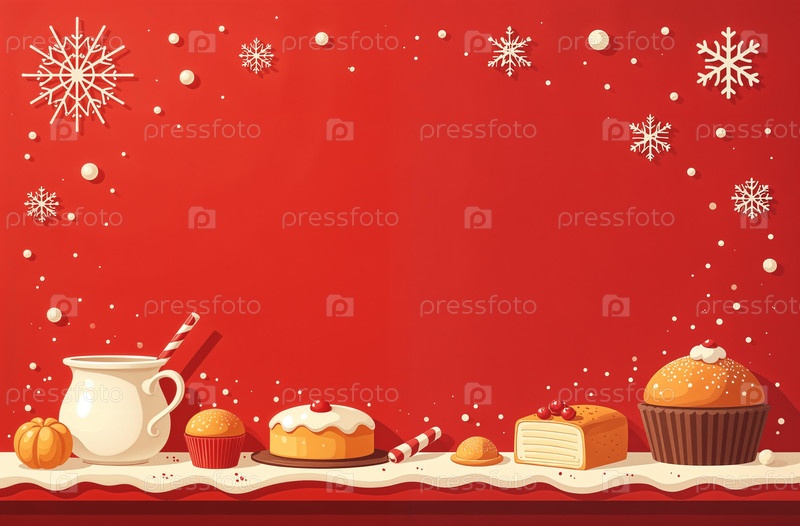 Созданная искусственным интеллектом рождественская выпечка, лежащая на красном столе, Новый год украшенный ледяными пирогами и тортами, открытка с пространством для текста