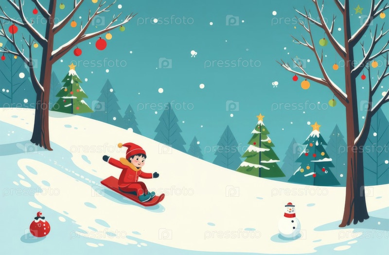 Искусственно созданные детские санки на снежном холме, ребенок веселится во время новогодних праздников, идет снег, рождественская елка в фоне