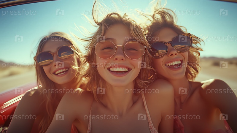Три счастливых молодых женщины улыбаются в кабриолете во время поездки по пустыне