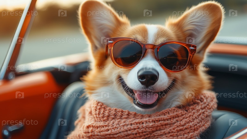 Собака-корги, носящая солнцезащитные очки в кабриолете