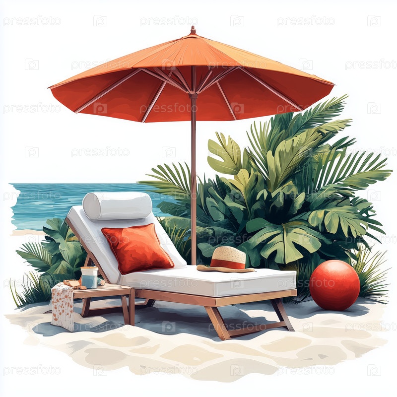 Шезлонг с красным зонтиком и аксессуарами для пляжа на тропическом берегу