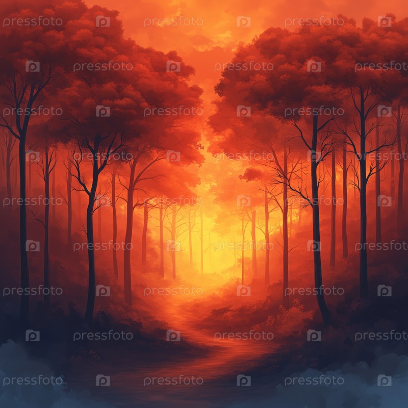 Зачарованная лесная тропа, сияющая теплым оранжевым и красным светом заката