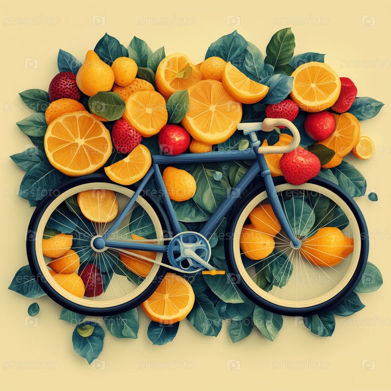 Синий велосипед с цитрусовыми фруктами и листьями на желтом фоне