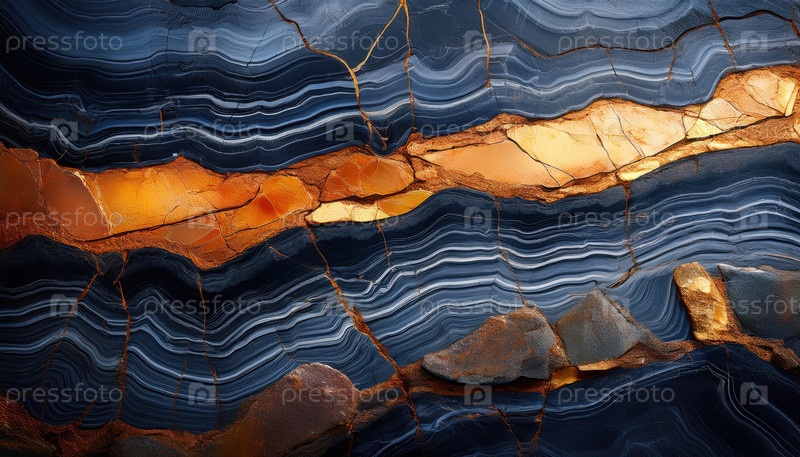 Темно-синяя и оранжевая текстура минеральных пород с яркими слоистыми линиями и трещинами в абстрактной композиции