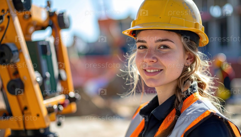 Молодая геодезистка в шлеме и жилете улыбается на строительной площадке с оборудованием вокруг