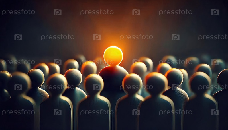 Одна яркая фигура выделяется из толпы силуэтов в тусклом свете, символизируя индивидуальность и лидерство