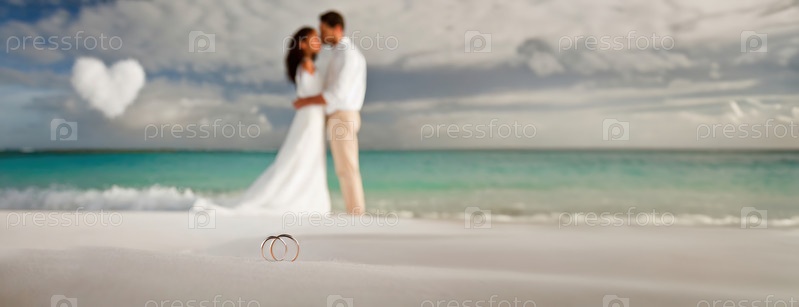 Свадебная пара обнимается на пляже, сосредоточившись на кольцах в песке, над головой - облако в форме сердца. Женщина и мужчина в праздничной белоснежной одежде на песчаном берегу. Панорама с копировальным пространством