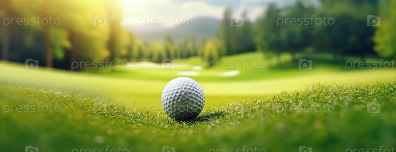 Мяч для гольфа на поле с горным фоном. Потрясающие зеленые горы. Готовы заиграть в олимпийском турнире. Панорама со копировальным пространством