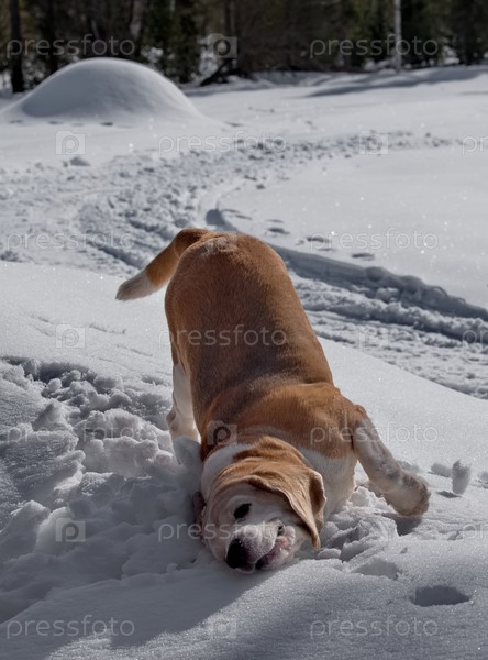 Россия. Кузбасс. Собака-бигль блуждает в мокром снегу, гуляет по весенней тайге. Это охотничий пес из группы собак для охоты на лесную дичь