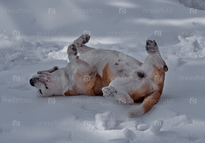 Россия. Кузбасс. Собака-бигль блуждает в мокром снегу, гуляет по весенней тайге. Это охотничий пес из группы собак для охоты на лесную дичь