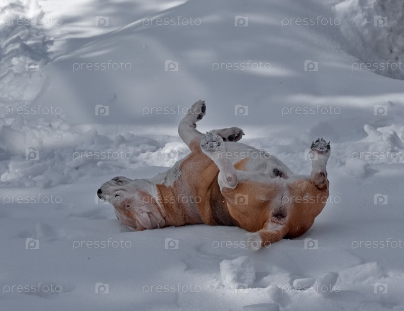 Россия. Кузбасс. Собака-бигль блуждает в мокром снегу, гуляет по весенней тайге. Это охотничий пес из группы собак для охоты на лесную дичь