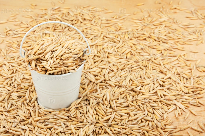 Белое ведро с овсяным зерном на деревянном полу