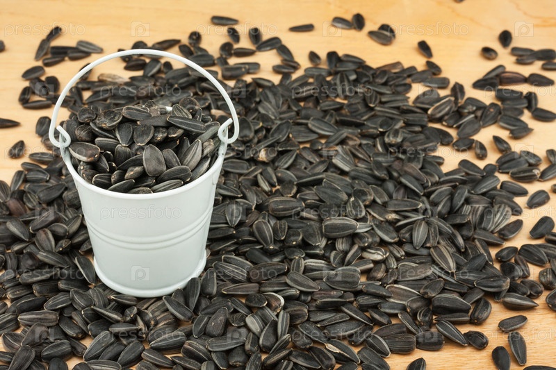 Белое ведро с семенами подсолнечника на деревянном полу