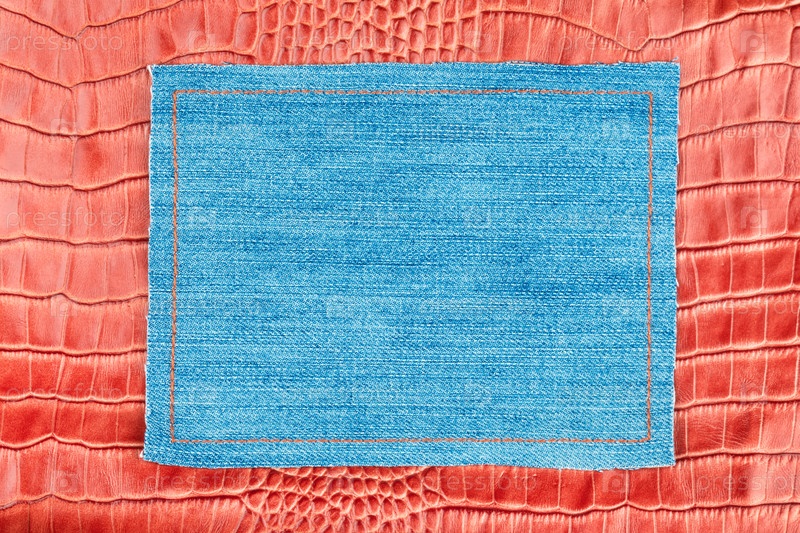 Круг джинса лежит на красной коже крокодила